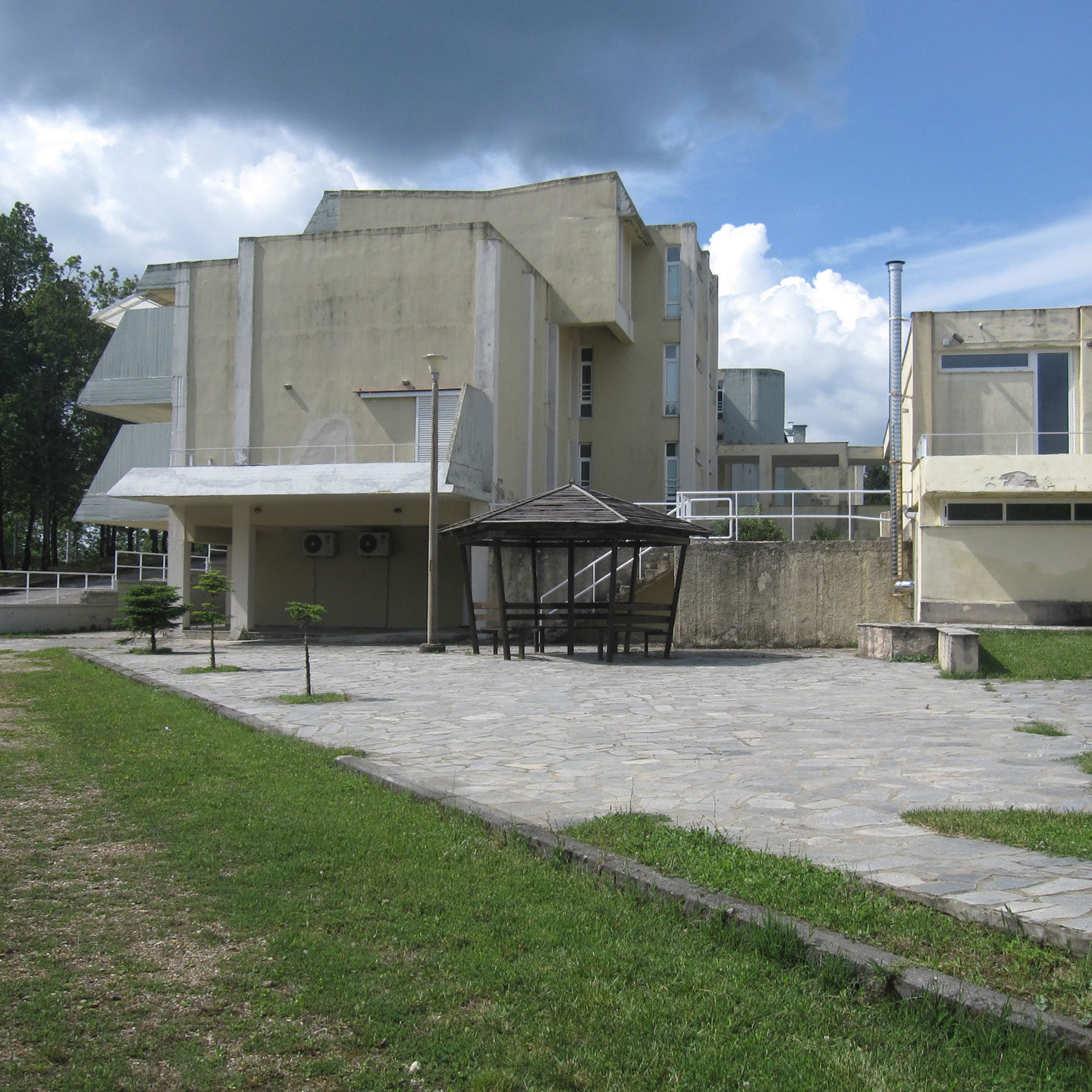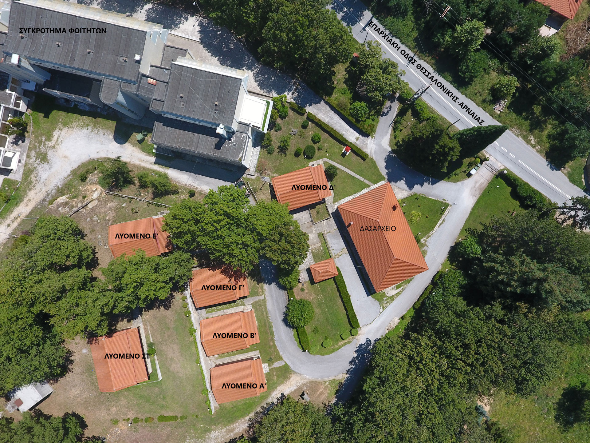 Χτίστηκε με οικοδομική άδεια του 1987 στο όνομα του ΑΡΙΣΤΟΤΕΛΕΙΟΥ ΠΑΝΕΠΙΣΤΗΜΙΟΥ ΘΕΣΣΑΛΟΝΙΚΗΣ. Το συγκρότημα αποτελείται από ένα τριώροφο κτίριο με υπόγειο και ένα ισόγειο κτίριο επ’ονόματι «Εργαστήρια» με δωμάτια, το Δασικό Μουσείο, αποθήκη και γήπεδο μπάσκετ.